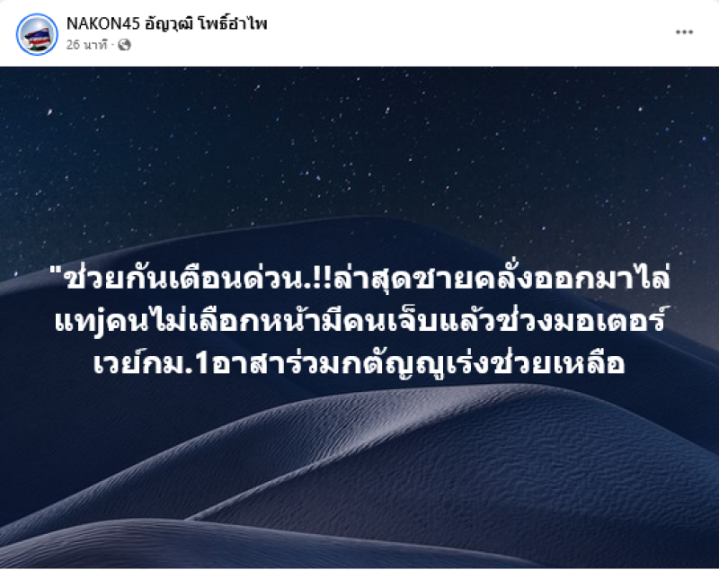 30 ก.ค. 2567 จากกรณี เฟซบุ๊กเพจ Nakorn 45 อัญวุฒิ โพธิ์อำไพ โพสต์ข้อความ ว่า "วิ่งกันกระเจิง.!! กู้ภัยเข้าช่วยเหลือรับผู้ป่วยจากสายด่วนถึงจุดเกิดเหตุผู้ป่วยจากดีๆไปเอามีD2เล่มไล่ฟันในพื้นที่ประเวศ"