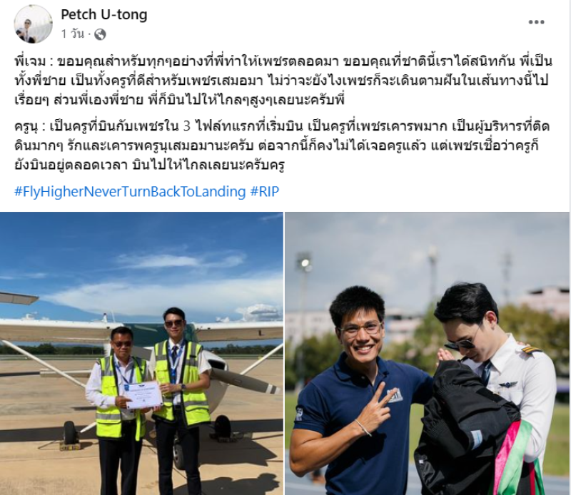 ครูนุ : เป็นครูที่บินกับเพชรใน 3 ไฟล์ทแรกที่เริ่มบิน เป็นครูที่เพชรเคารพมาก เป็นผู้บริหารที่ติดดินมากๆ รักและเคารพครูนุเสมอมานะครับ ต่อจากนี้ก็คงไม่ได้เจอครูแล้ว แต่เพชรเชื่อว่าครูก็ยังบินอยู่ตลอดเวลา บินไปให้ไกลเลยนะครับครู