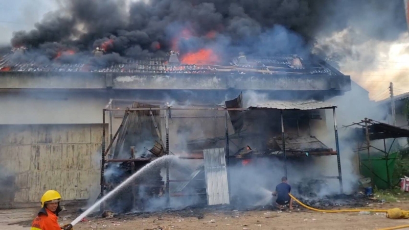 ซึ่งเป็นเชื้อเพลิงอย่างดี จึงทำให้การดับไฟเป็นไปค่อนข้างยาก เจ้าหน้าที่ต้องประสานขอรถโฟมในพื้นที่ใกล้เคียงให้มาช่วยทำการดับไฟ แต่ยังต้องใช้น้ำฉีดหล่อเลี้ยงตัวอาคารไว้ตลอดเวลาเพื่อให้คลายความร้อนใช้เวลานานกว่า 1 ชั่วโมง เพลิงจึงสงบ แต่ก็ยังต้องคอยฉีดน้ำหล่อเลี้ยงไว้ โดยมี นายจำนงค์ จันทร์วงศ์ หัวหน้าปลัดอำเภอฝ่ายความมั่นคง อ.เมือง และนายวสันต์ กลิ่นสุคนธ์ นายก อบต.ดอนตะโก มาคอยช่วยดูแลเรื่องของการดับเพลิง
