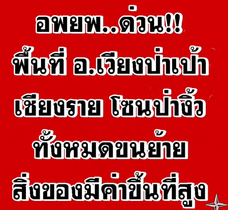 23 ก.ย. 67 สมาคมตอบโต้ภัยพิบัติฯ ได้ออกมา่โพสต์แจ้งเตือนโดยได้ระบุข้อความว่า อพยพด่วน พื้นที่ อ.เวียงป่าเป้า #เชียงราย โซนป่างิ้ว ทั้งหมด ขนย้ายสิ่งของมีค่าขึ้นที่สูง หรือนำไปฝากเพื่อนที่บ้านน้ำไม่ท่วม อย่าขังน้องหมา น้องแมวไว้ น้ำกำลังขึ้นสูงเรื่อยๆ ให้พาออกตั้งแต่ออกได้ ก่อนที่น้ำจะสูงแล้วช่วยลำบากครับ