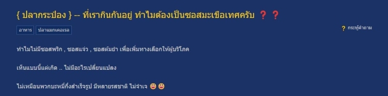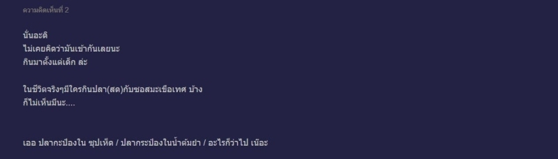ด้านความคิดเห็นของชาวเน็ตมองว่า นั่นอะดิ ไม่เคยคิดว่ามันเข้ากันเลยนะ กินมาตั้งแต่เด็กล่ะ ในชีวิตจริงๆ มีใครกินปลา(สด)กับซอสมะเขือเทศบ้าง ก็ไม่เห็นมีนะ เออ ปลากะป๋องใน ซุปเห็ด ปลากระป๋องในน้ำต้มยำ / อะไรก็ว่าไป เน๊อะ