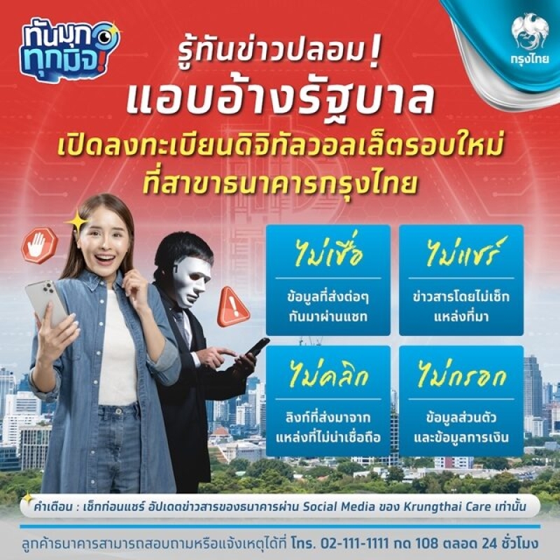 คำเตือน เช็กก่อนแชร์ อัปเดตข่าวสารของธนาคารผ่านโซเชียลมีเดีย Krungthai Care เท่านั้น และสามารถตรวจสอบข่าวได้ที่ ศูนย์ต่อต้านข่าวปลอมประเทศไทย