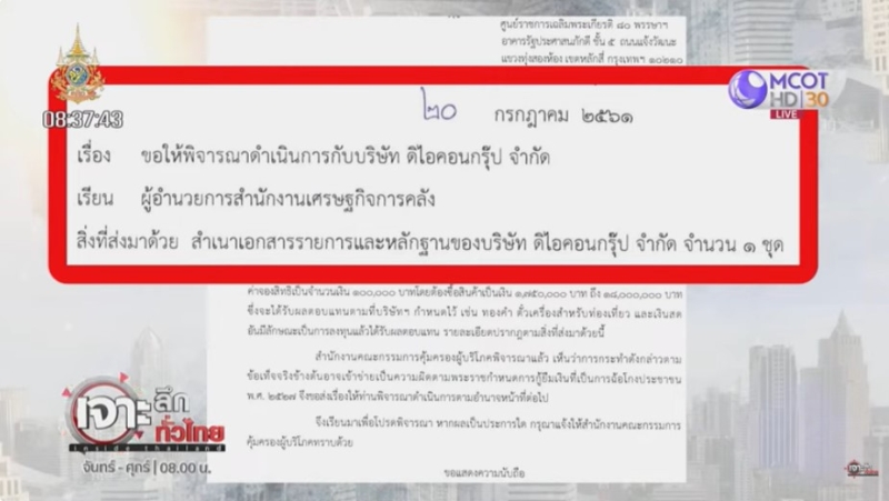ล่าสุด วันที่ 11 ต.ค. 67 รายการเจาะลึกทั่วไทย ดำเนินรายการโดย ดนัย เอกมหาสวัสดิ์ หรือหมาแก่ และแมวสาว อมรรัตน์ ได้พูดคุยถึงประเด็นนี้ พร้อมระบุเหตุการณ์นี้เกิดขึ้นตั้งแต่ปี 2561 โดยตอนนั้น ผอ.กองคุ้มครองผู้บริโภค ด้านธุรกิจขายตรง สำนักงานคณะกรรมการคุ้มครองผู้บริโภค (สคบ.) ทำหนังสือถึง เลขาธิการสคบ. ในขณะนั้น เพื่อรายงานข้อเท็จจริงเกี่ยวกับการทำงานของดิไอคอนกรุ๊ป และให้ตรวจสอบการทำธุรกิจของบริษัทดังกล่าว เข้าข่ายการทำธุรกิจขายตรงหรือไม่ และเข้าข่ายแชร์ลูกโซ่หรือไม่