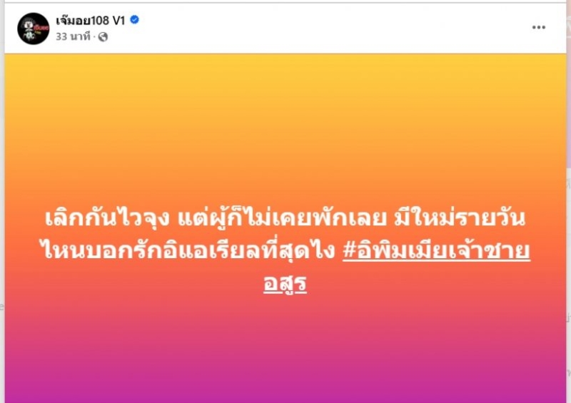 จากกรณี เพจดัง โพสต์ปริศนาให้เดา ว่ามีคู่รักคู่หนึ่งเลิกกันแล้ว แถมฝ่ายชายก็มูฟออนเร็วโดย เพจเจ๊มอย 108 โพสต์ทิ้งการบ้านไว้ว่า "เลิกกันไวจุง แต่ผู้ก็ไม่เคยพักเลย มีใหม่รายวัน ไหนบอกรักอิแอเรียลที่สุดไง #อิพิมเมียเจ้าชายอสูร"
