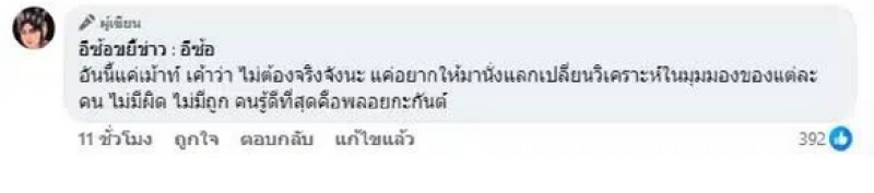 ต่อมาอีซ้อขยี้ข่าวก็ได้คอมเมนต์ข้อความเพิ่มเติมที่ใต้โพสต์ดังกล่าว ระบุว่า “อันนี้แค่เม้าท์ เค้าว่า ไม่ต้องจริงจังนะ แค่อยากให้มานั่งแลกเปลี่ยนวิเคราะห์ในมุมมองของแต่ละคน ไม่มีผิด ไม่มีถูก คนรู้ดีที่สุดคือพลอยกะกันต์