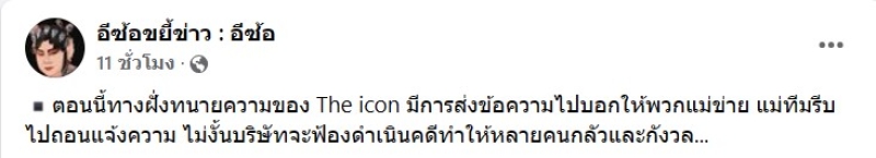 ล่าสุด มางเพจดัง อย่าง อีซ้อขยี้ข่าว : อีซ้อ ได้ออกมาเผยแชท โดยอ้างว่า เป็นฝั่งทนายของดิไอคอน ส่งข้อความไปหาบรรดาแม่ข่าย ให้ไปถอนแจ้งความ โดยระบุว่า ตอนนี้ทางฝั่งทนายความของ The icon มีการส่งข้อความไปบอกให้พวกแม่ข่าย แม่ทีมรีบไปถอนแจ้งความ ไม่งั้นบริษัทจะฟ้องดำเนินคดีทำให้หลายคนกลัวและกังวล