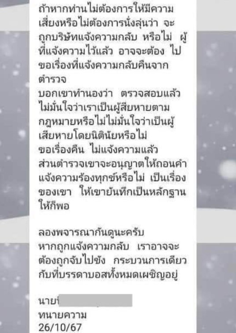 พร้อมกับโพสต์ข้อความแชทที่ได้รับมาจากคนหนึ่ง พูดถึงการข่มขู่ว่าให้ไปถอนแจ้งความไม่เช่นนั้นจะถูกดำเนินคดีนั้นเอง