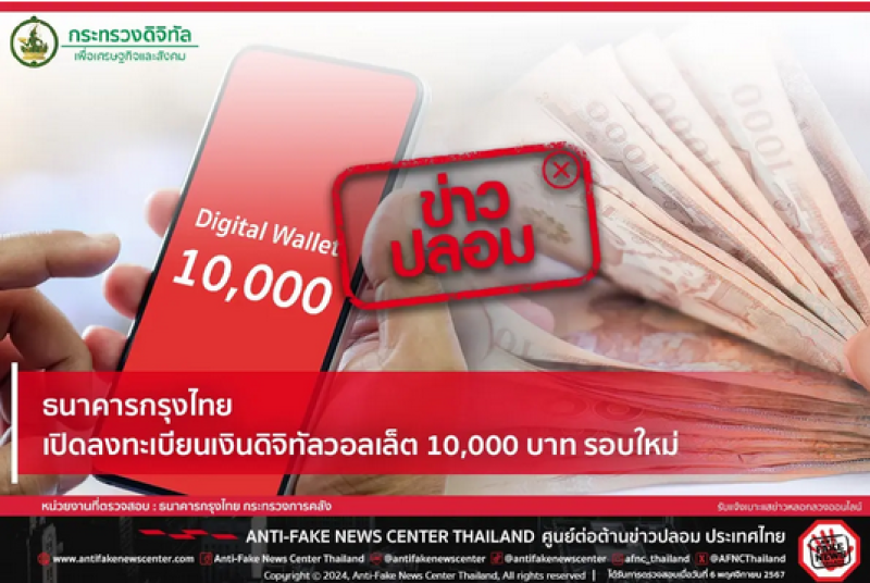จากประเด็นเรื่องธนาคารกรุงไทย เปิดลงทะเบียนเงินดิจิทัลวอลเล็ต 10,000 บาท รอบใหม่ ทางศูนย์ต่อต้านข่าวปลอมได้ดำเนินการตรวจสอบข้อเท็จจริงร่วมกับธนาคารกรุงไทย กระทรวงการคลัง พบว่าข้อมูลดังกล่าว เป็นข้อมูลเท็จ