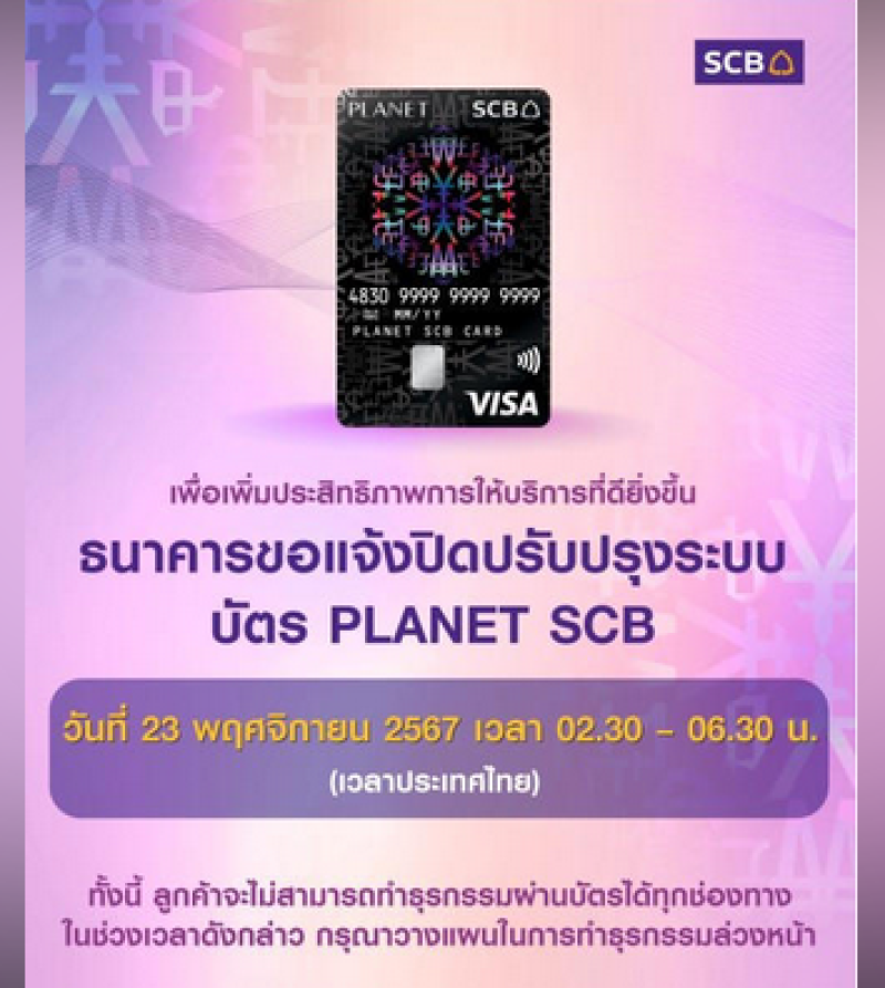 ธนาคารไทยพาณิชย์ แจ้งปิดปรับปรุงระบบบัตร PLANET SCB ในวันที่ 23 พฤศจิกายน เวลา 02.30 -06.30 น. โดยในช่วงเวลาดังกล่าวลูกค้าจะไม่สามารถทำธุรกรรมผ่านบัตรได้ทุกช่องทาง กรุณาวางแผนการทำธุรกรรมล่วงหน้า