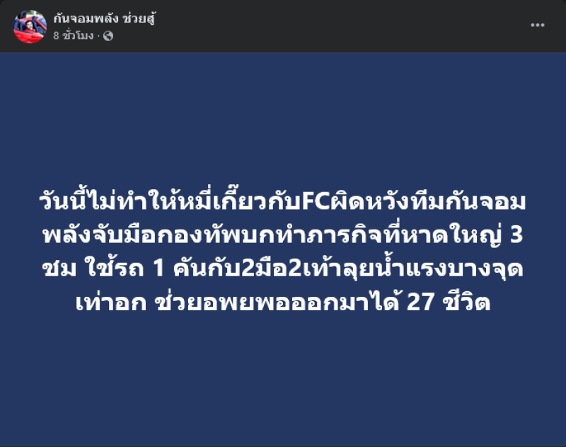 ทั้งนี้ กัน จอมพลัง ยังโพสต์ต่ออีกว่า วันนี้ไม่ทำให้หมี่เกี๊ยวกับFCผิดหวังทีมกันจอมพลังจับมือกองทัพบกทำภารกิจที่หาดใหญ่ 3 ชม ใช้รถ 1 คันกับ2มือ2เท้าลุยน้ำแรงบางจุดเท่าอก ช่วยอพยพอออกมาได้ 27 ชีวิต
