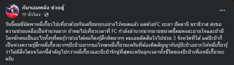 จากเหตุการณ์อุทกภัยน้ำท่วมภาคใต้อย่างหนักได้มีเจ้าหน้าที่หลายหน่วยงานเร่งเข้าช่วยเหลือรวมถึงทีมของ กัน จอมพลัง ซึ่ง กัน จอมพลัง ได้โพสต์ข้อความขอโทษลูกสาวที่ต้องผิดสัญญา ผ่านเฟศบุ๊ค กันจอมพลัง ช่วยสู้ โดยระบุข้อความว่า วันนี้ผมมีนัดพาหมี่เกี๊ยวไปเที่ยวด้วยกันเตรียมทุกอย่างไว้หมดแล้ว แต่ด้วยFC ยะลา ปัตตานี นราธิวาส ส่งขอความช่วยเหลือเป็นจำนวนมาก