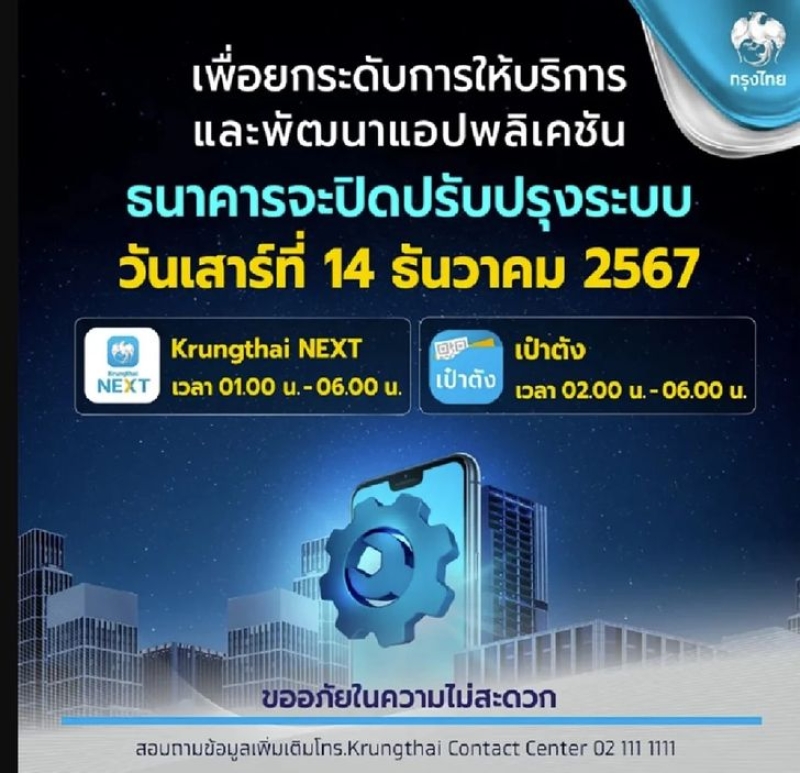 ประกาศผ่านเพจเฟซบุ๊ก Krungthai Care แจ้งว่า เพื่อยกระดับการให้บริการแลพัฒนาแอปพลิเคชัน ธนาคารจะปิดปรับปรุงระบบในวันเสาร์ที่ 14 ธ.ค. 67