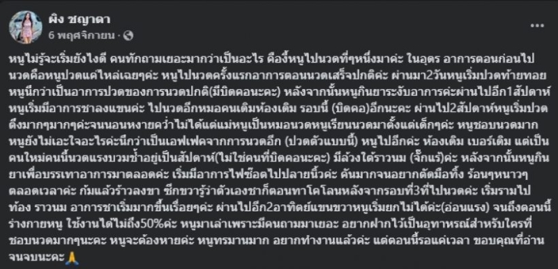 อยากฝากไว้เป็นอุทาหรณ์สำหรับใครที่ชอบนวดมากๆนะคะ หนูจะต้องหายค่ะ หนูทรมานมาก อยากทำงานแล้วค่ะ แต่ตอนนี้รอแค่เวลา ขอบคุณที่อ่านจนจบนะคะ