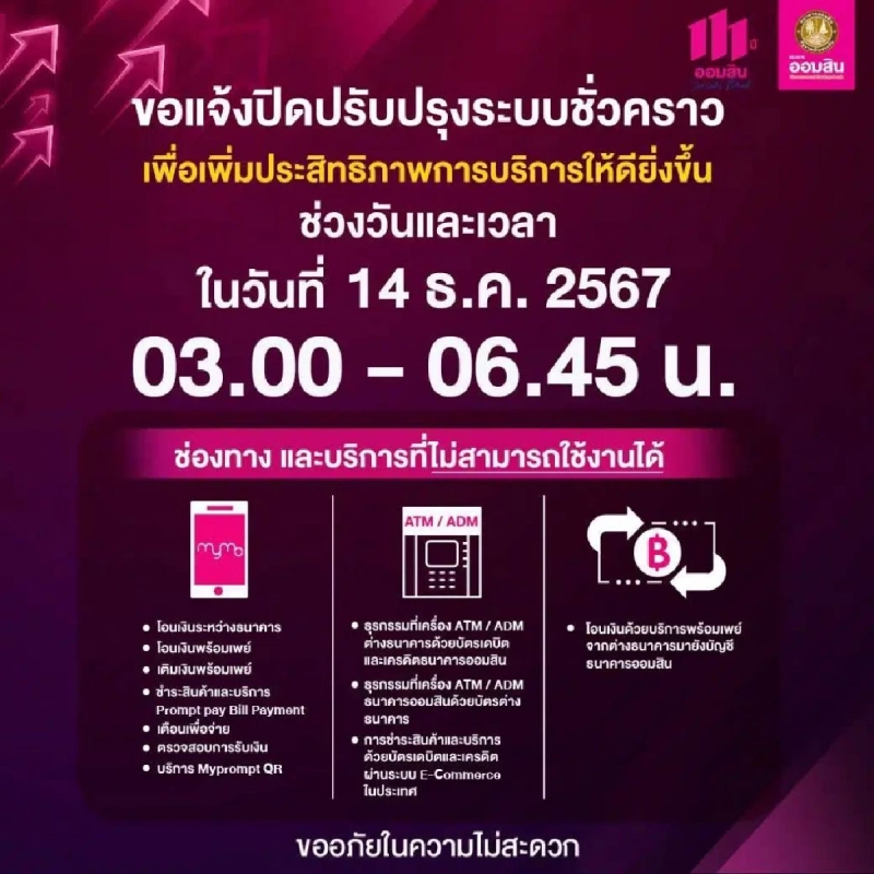 ธนาคารออมสิน ขอแจ้งปิดปรับปรุงระบบงานบางส่วนชั่วคราว เพื่อเพิ่มประสิทธิภาพการบริการให้ดียิ่งขึ้น ทำให้ลูกค้าไม่สามารถใช้บริการได้ในวันที่ 14 ธันวาคม 2567 เวลา 03.00 – 06.45 น. โดยกำหนดปิดระบบชั่วคราวในช่วงเวลาที่มีการทำธุรกรรมน้อยที่สุด และคำนึงถึงผลกระทบต่อผู้ใช้บริการเป็นสำคัญ