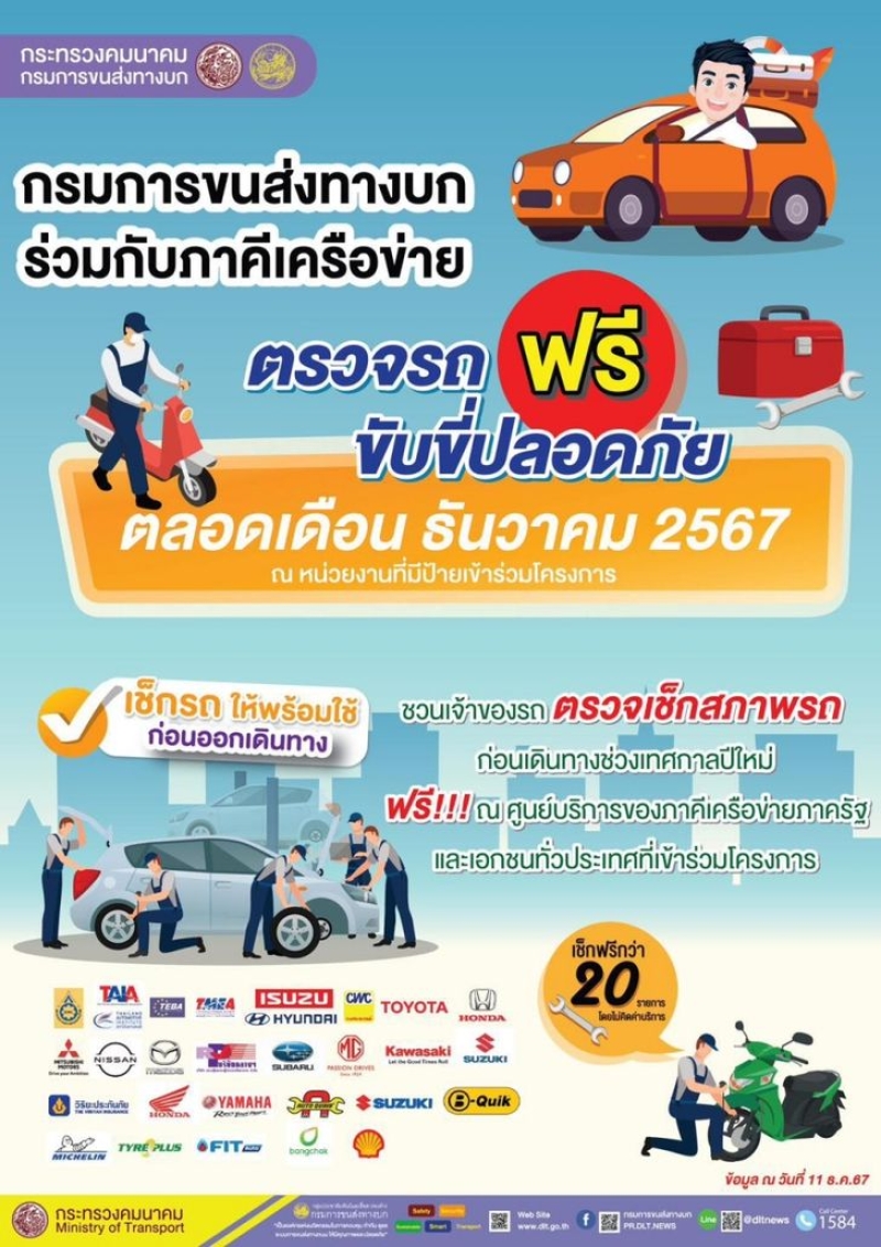 ทาง กรมการขนส่งทางบก จับมือหน่วยงานภาครัฐและเอกชน จัดกิจกรรม "ตรวจรถฟรี ขับขี่ปลอดภัย" เปิดให้บริการตรวจสภาพรถก่อนเดินทางช่วงเทศกาลปีใหม่ ตลอดเดือนธันวาคม 2567 นี