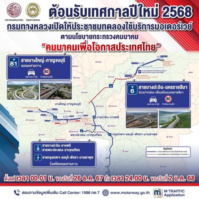 การยกเว้นทางผ่านทางหลวงพิเศษระหว่างเมือง (มอเตอร์เวย์) และการเปิดทดลองวิ่ง มีขึ้นตั้งแต่เวลา 00.01 น. ของวันที่ 26 ธันวาคม 2567 ถึง เวลา 24.00 น. ของวันที่ 2 มกราคม 2568 รวมทั้งสิ้น 8 วัน โดยมีรายละเอียด ดังนี้