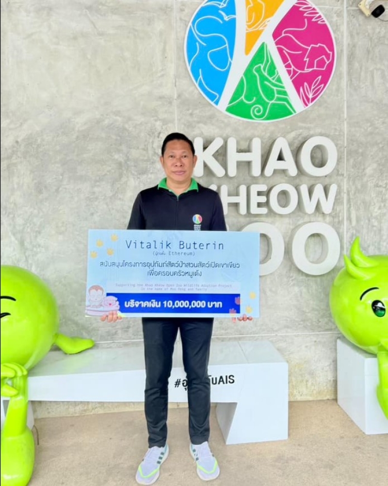 ยังจำได้ไหม Vitalik Buterin นักพัฒนาซอฟต์แวร์ เป็นเศรษฐีระดับโลก ที่กอ่นหน้านั้นเคยเดินทางมาดูหมูเด้ง และซื้อผัดกระเพรามาฝาก ล่าสุดทางเพจ ขาหมู แอนด์เดอะแก๊ง ได้ออกมาเผยว่า หลังจากครั้งที่เเล้วซื้อผัดกระเพรามาฝาก รอบนี้คุณ Vitalik Buterin สนับสนุนเงิน 10,000,000 บาท ในโครงการอุปถัมภ์สัตว์ป่า เพื่อสร้างบ้านใหม่ให้หมูเด้ง เเล้วเจอกันกับบ้านใหม่หมูเด้งเร็วๆนี้