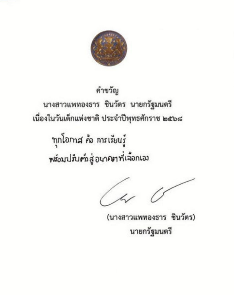 นางสาวแพทองธาร กล่าวว่าบางทีเราอาจจะคิดว่าเป็นมนุษย์ตัวเล็กๆ คงไม่ได้ทำอะไรมากมาย สิ่งที่รัฐบาลมองเห็นคือคุณค่า คุณภาพ ในตัวของน้องๆ ตัวเล็กๆ เด็กๆ ทุกคน เพราะว่าอนาคตจะเป็นอย่างไร ประเทศไทยจะน่าอยู่หรือไม่ขึ้นอยู่กับน้องๆ