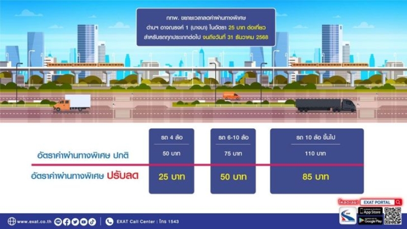 การทางพิเศษแห่งประเทศไทย (กทพ.) ขยายระยะเวลาการให้ส่วนลดค่าผ่านทางพิเศษของทางพิเศษเฉลิมมหานครที่ด่านทางพิเศษอาจณรงค์ 1 (บางนา) ในอัตรา 25 บาทต่อเที่ยว สำหรับรถทุกประเภทไปจนถึงวันที่ 31 ธันวาคม 2568