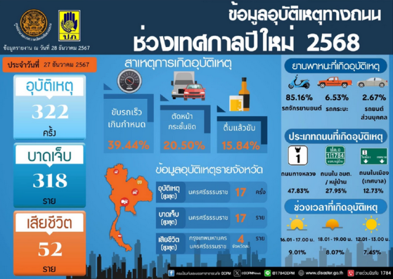สำหรับข้อมูลอุบัติเหตุทางถนนช่วงเทศกาลปีใหม่ 2568 ประจำวันที่ 27 ธันวาคม 2567 ซึ่งเป็นวันแรกของการรณรงค์ “ขับขี่ปลอดภัย เมืองไทยไร้อุบัติเหตุ” ศูนย์อำนวยการป้องกันและลดอุบัติเหตุทางถนนช่วงเทศกาลปีใหม่ พ.ศ. 2568 โดยกรมป้องกันและบรรเทาสาธารณภัยและความร่วมมือของหน่วยงานภาคีเครือข่ายได้รวบรวมสถิติอุบัติเหตุทางถนนประจำวันที่ 27 ธันวาคม 2567 โดยเกิดอุบัติเหตุ 322 ครั้ง ผู้บาดเจ็บ 318 คน ผู้เสียชีวิต 52 ราย