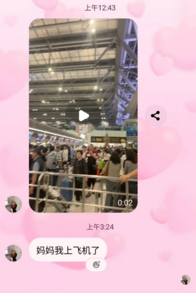 ด้าน นางสุธิณี อายุ 43 ปี แม่น้องเหมย ทราบว่าได้มีสายการบินเจจูแอร์ โทรมาบอกว่าตอนนี้ยังหาร่างน้องเหมย ยังไม่พบเพราะถูกไฟคลอกเกรียม และนางสุธิณี เปิดเผยแชทน้องเหมย ส่งหาแม่ว่ากำลังจะขึ้นเครื่องที่สุวรรณภูมิ เวลาประมาณ 00.24 น. ของวันที่ 29 ธ.ค. ตามเวลาประเทศไทย ซึ่งเป็นข้อความสุดท้าย ก่อนเกิดเหตุสลด