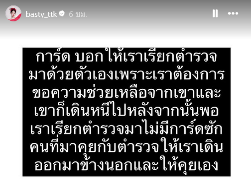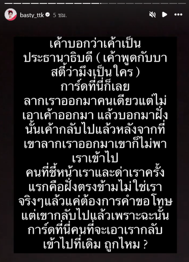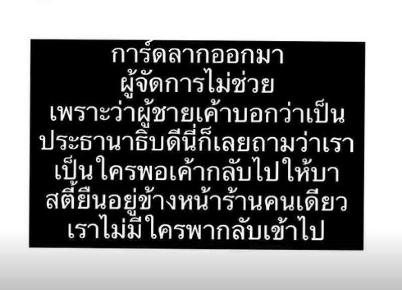 การ์ดคนนี้มีเรื่องกับทุกคนตลอด ไหว้กับทุกคน หนูไม่ได้ผิด หนูพยายามอธิบายว่า เขามาด่าหนูก่อนว่า xึงเป็นใคร xึงออกไปเดี๋ยวนี้ ด่าหนู 3 รอบ หนูตอบกลับไปว่าแล้วxึงเป็นใคร การ์ดลากหนูออกมา แล้วไม่มีใครพาหนูกลับเข้าไป ส่วนอีกฝั่งกลับไปแล้ว