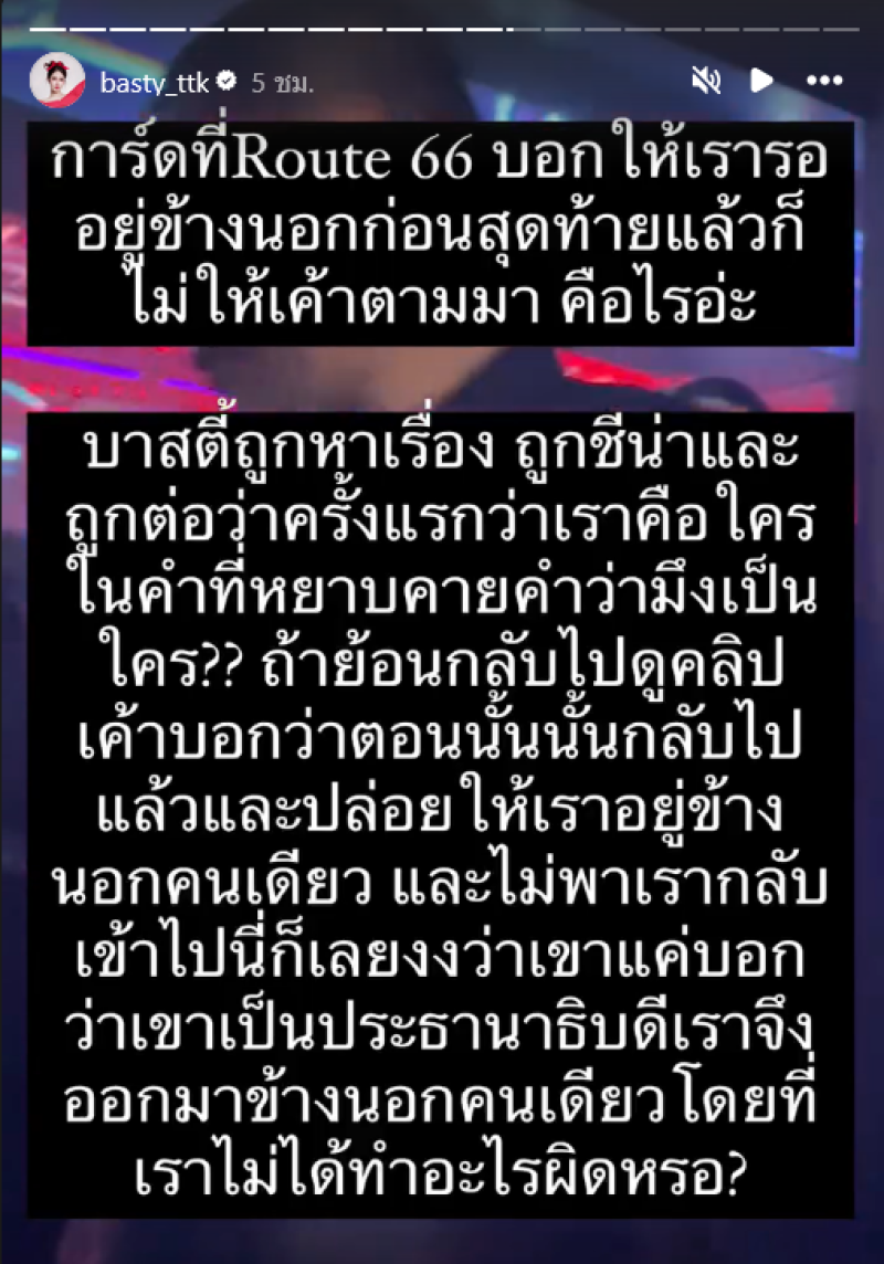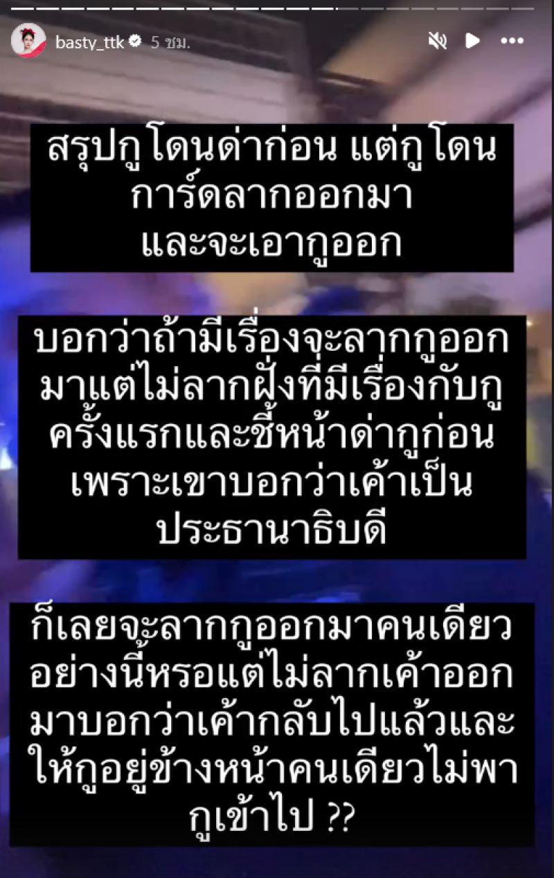 กลายเป็นเรื่องราวที่ทำเอาอินฟูลชื่อดังอย่าง บาสตี้ ฐิติกร ถึงกลับเดือดและได้โพสต์ลงสตอรี่อินสตาแกรมรัวๆ โดยเล่าว่า ถูกการ์ดร้านดังย่านRCA ลากออกมาหน้าร้าน หลังมีผู้ชายบอกว่าเป็นประธานาธิบดี แล้วถาม บาสตี้ ว่าเป็นใคร บาสตี้ เลยถามกลับเช่นกัน ก่อนการ์ดของร้านจะลากตัวบาสตี้ออกมาหน้าร้าน จากนั้น บาสตี้ ได้ลงสตอรี่พร้อมข้อความเล่าเหตุการณ์ว่า
