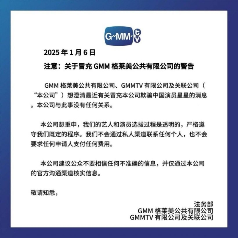 ไม่มีส่วนเกี่ยวข้องใดๆ กับกรณีนักแสดงชาวจีนหายตัวที่แม่สอด บริษัทขอย้ำว่ากระบวนการคัดเลือกศิลปินและนักแสดงของเรามีความโปร่งใส และปฏิบัติตามขั้นตอนที่กำหนดไว้อย่างเคร่งครัด เราจะไม่ติดต่อบุคคลใดๆ ผ่านช่องทาง ส่วนตัว และจะไม่ขอให้ผู้สมัครรายใดจ่ายค่าธรรมเนียมใดๆ บริษัทขอแนะนำให้ประชาชนไม่เชื่อในข้อมูลที่ไม่ถูกต้อง และตรวจสอบข้อมูลผ่านช่องทางการสื่อสารอย่างเป็นทางการของบริษัทเท่านั้น