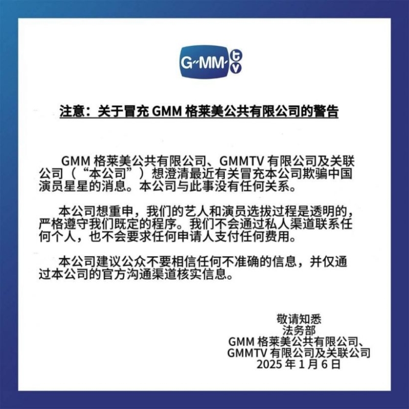 บริษัทขอย้ำว่ากระบวนการคัดเลือกศิลปินและนักแสดงของเรามีความโปร่งใส และปฏิบัติตามขั้นตอนที่กำหนดไว้อย่างเคร่งครัด เราจะไม่ติดต่อบุคคลใดๆ ผ่านช่องทาง ส่วนตัว และจะไม่ขอให้ผู้สมัครรายใดจ่ายค่าธรรมเนียมใดๆ