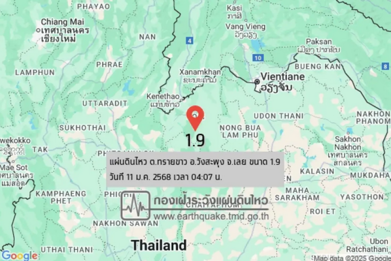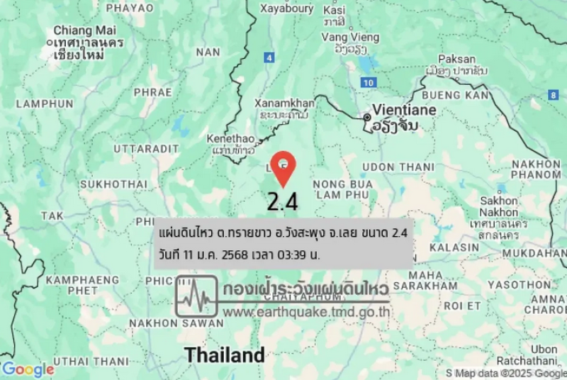 รายงานเหตุการณ์วันนี้ สะเทือนต่อเนื่อง 2 ครั้งติด ระทึก! กองเฝ้าระวังแผ่นดินไหว กรมอุตุนิยมวิทยา รายงานเกิดเหตุแผ่นดินไหว "เลยแผ่นดินไหว" วันนี้ 11 มกราคม 2568 เมื่อเวลา 03.39 น. ขนาด 2.4 จุดศูนย์กลางแผ่นดินไหว ประเทศไทย ต.ทรายขาว อ.วังสะพุง จ.เลย ความลึก 1 กม. และเมื่อเวลา 04.07 น. เกิดเหตุแผ่นดินไหว ขนาด 1.9 อีกครั้ง