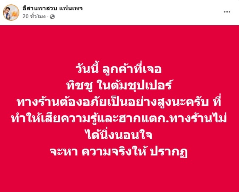 โดยโพสต์ว่า วันนี้ลูกค้าที่เจอทิชชู่ ในต้มซุปเปอร์ ทางร้านต้องขออภัยเป็นอย่างสูงนะครับ ที่ทำให้เสียความรู้สึกและฮากแตก ทางร้านไม่ได้นิ่งนอนใจ จะหาความจริงให้ปรากฏ