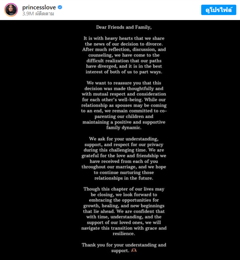 Princess Love ยังได้เผยจดหมายผ่านอินสตาแกรมด้วยว่า เราขอแจ้งข่าวการตัดสินใจหย่าร้างด้วยใจที่หนักหน่วง หลังการใคร่ครวญ หารือ และให้คำปรึกษากันมากมาย เราก็ได้ตระหนักรู้ถึงความยากลำบากที่เส้นทางของเราแตกต่างออกไป และจะเป็นไปเพื่อประโยชน์สูงสุดของเราทั้งคู่ เพื่อแยกทางกัน เราอยากจะบอกคุณว่าการตัดสินใจครั้งนี้เกิดขึ้นอย่างรอบคอบและด้วยความเคารพและการคำนึงถึงความเป็นอยู่ที่ดีของกันและกัน แม้ว่าความสัมพันธ์ของเราในฐานะคู่สมรสอาจจะถึงจุดสิ้นสุด แต่เรายังคงมุ่งมั่นที่จะร่วมเลี้ยงดูลูก ๆ ของเราและรักษาพลังครอบครัวเชิงบวก
