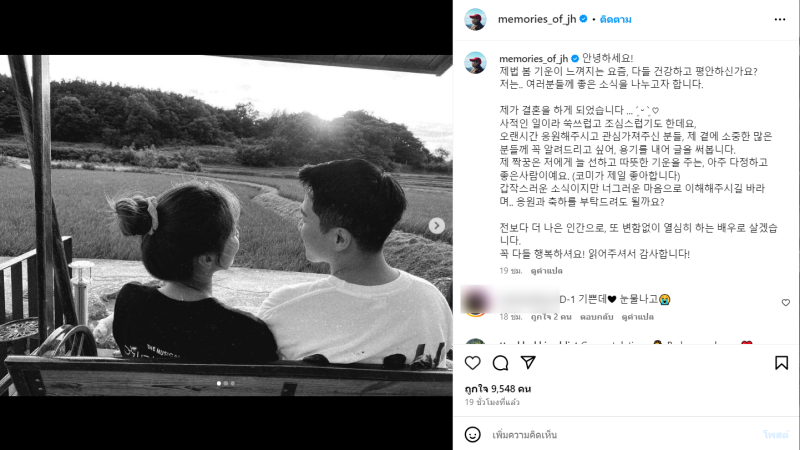 จาก สำนักข่าวต่างประเทศ ได้รายงานว่า นักแสดงสาว ฮงจีฮี (Hong Ji Hee) ได้ใช้ Instagram เพื่อแบ่งปันข่าวที่น่าตื่นเต้นเกี่ยวกับการแต่งงานของเธอ
