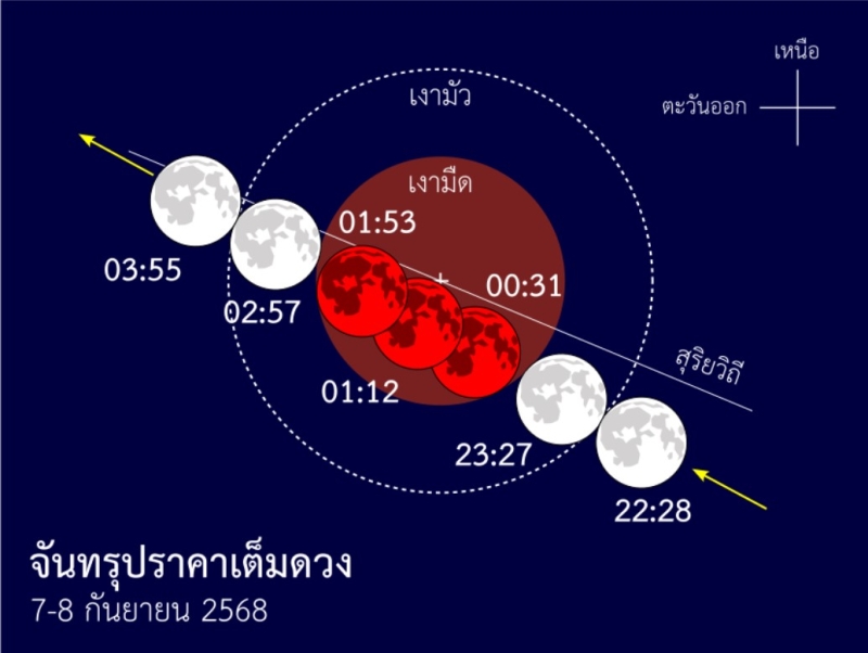 วันที่ 7-8 ก.ย. 68 ที่จะถึงนี้ จะเกิด “จันทรุปราคาเต็มดวง” ในเดือนกันยายนได้เพียงครั้งเดียวในรอบปีนี้ ซึ่งมองเห็นได้ในประเทศไทยรวมทั้งทวีปยุโรป แอฟริกา เอเชีย ออสเตรเลียและนิวซีแลนด์ สังเกตได้ตั้งแต่เวลา 23:27 น. เมื่อดวงจันทร์เริ่มสัมผัสเงามืด จันทรุปราคาเต็มดวงเกิดขึ้นระหว่างเวลา 00:31 – 01:53 น. โดยบังลึกที่สุดเวลา 01:12 น. ช่วงที่ถูกเงามืดของโลกบดบังทั้งดวง ดวงจันทร์ไม่ได้มืดสนิท แต่มีสีแดงเนื่องจากแสงอาทิตย์เกิดการกระเจิงและหักเหผ่านบรรยากาศโลก ดวงจันทร์จะกลับมาสว่างเต็มดวงเมื่อดวงจันทร์ทั้งดวงออกจากเงามืดในเวลา 02:57 น. ขณะเกิดปรากฏการณ์ดวงจันทร์อยู่ในกลุ่มดาวคนแบกหม้อน้ำ มองเห็นดาวเสาร์อยู่ห่างดวงจันทร์ประมาณ 15°