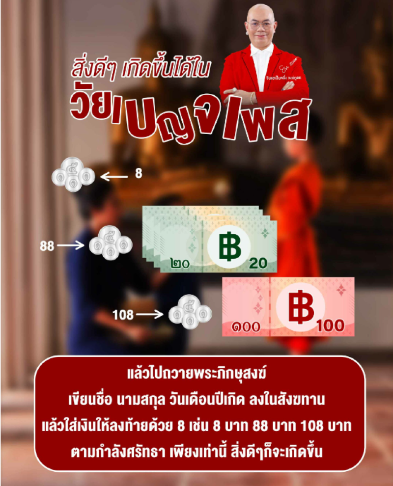 แล้วไปถวายพระภิกษุสงฆ์ เขียนชื่อ นามสกุล วันเดือนปีเกิด ลงในสังฆทาน แล้วใส่เงินให้ลงท้ายด้วย 8 เช่น 8 บาท 88 บาท 108 บาทตามกำลังศรัทธา เพียงเท่านี้ สิ่งดี ๆ ก็จะเกิดขึ้น