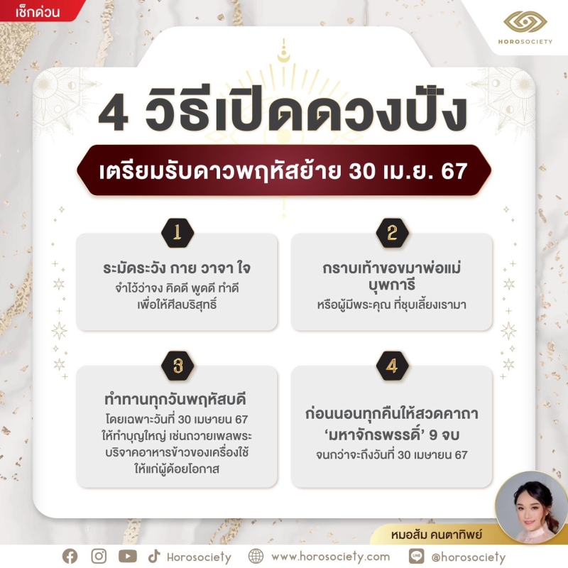 วันที่ 23 เมษายน 67 ทางเพจ Horosociety โดยหมอส้ม คนตาทิพย์ ได้เผย 4 วิธี เปิดดวงปัง เตรียมรับดาวพฤฤหัสย้าย 30 เม.ษ. 67