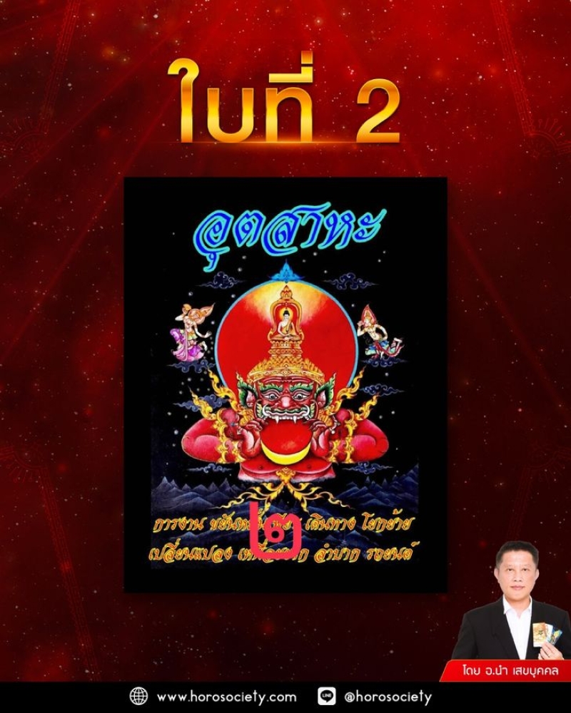 ไพ่ใบที่ 2 ให้คุณทำบุญเกี่ยวกับค่ายวดยานพาหนะให้แก่พระภิกษุสามเณร หรือทำบุญด้วยรองเท้า ทำบุญอุปกรณ์ทางการแพทย์หรือเครื่องมือแพทย์ ก็จะเสริมทำให้คุณดวงดีและประสบความสำเร็จไปในทิศทางที่ดี พ้นจากความทุกข์ยากลำบาก