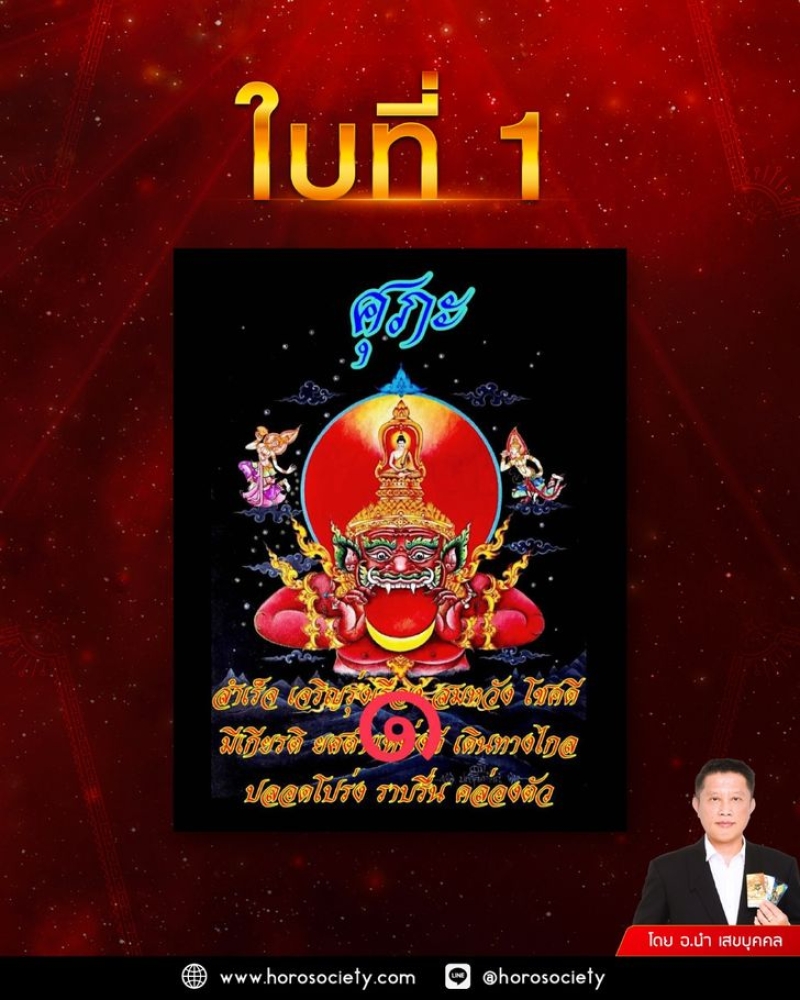 ใบที่ 1 ให้คุณทำบุญเกี่ยวกับการบำรุงเลี้ยงดูบิดามารดาให้มีความสุข ดูแลพ่อแม่บุพการีหรือคนรอบข้างให้อยู่ดีมีสุข หรือจะทำบุญด้วยกันสร้างพระหล่อพระทำบุญหนังสือธรรมะหนังสือสวดมนต์ ก็จะทำให้คุณดวงดีมีโอกาสเติบโตได้เป็นใหญ่เป็นโตหรือมีความสุขมีความเจริญ