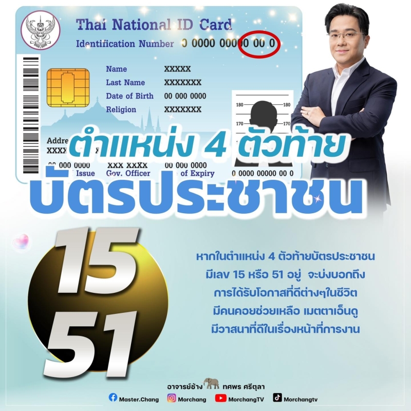 หากในตําแหน่ง 4 ตัวท้ายบัตรประชาชน มีเลข 15 หรือ 51 อยู่ จะบ่งบอกถึง การได้รับโอกาสที่ดีต่างๆในชีวิต มีคนคอยช่วยเหลือ เมตตาเอ็นดู มีวาสนาที่ดีในเรื่องหน้าที่การงาน