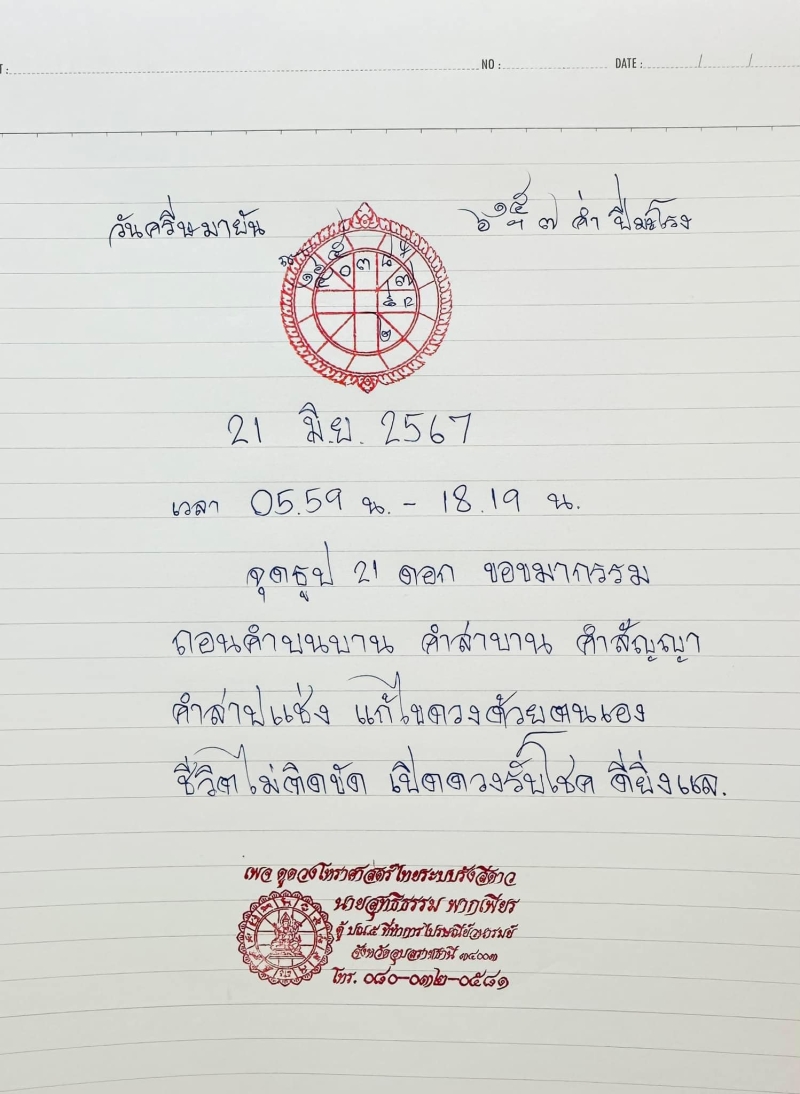 วันที่ 21 มิถุนายน 2567 อาจารย์สุทธิธรรม พากเพียร ผู้เชี่ยวชาญวิชาโหราศาสตร์ไทย และโหราศาสตร์สากล เจ้าของเพจเฟซบุ๊ก ดูดวงโหราศาสตร์ไทยระบบรังสีดาว ได้เผยฤกษ์ดีสำหรับการจุดธูป 21 ดอก ขอขมากรรม ถอนคำบนบานศาลกล่าว คำสาบาน คำสัญญา คำสาปแช่ง โดยวันที่ 21 มิถุนายน นั้น ตรงกับวัน ครีษมายัน ซึ่งเป็นวันที่กลางวันยาวนานที่สุดในรอบปี เชื่อว่าเป็นช่วงเวลาที่ห้วงมิติแต่ละภพเชื่อมต่อถึงกัน