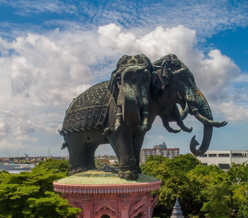 ไหว้สักการะขอพร ช้างเอราวัณ หรือ ช้างสามเศียร ที่สร้างขึ้นจากทองแดงใช้ เทคนิคการเคาะขึ้นรูปด้วยมือแห่งแรกและแห่งใหญ่ที่สุดในโลก ที่พิพิธภัณฑ์ช้าง เอราวัณ จังหวัดสมุทรปราการ