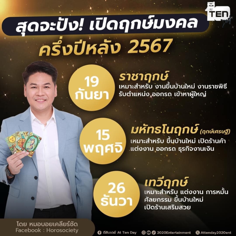 เมื่อวันที่ 30 ก.ค. 67 ที่ผ่านมา ทางเพจ หมอบอย เคลียร์ชัด นักดูดวงและราศี ได้เผย ฤกษ์ดี มีชัย ในครึ่งปีหลัง 2567