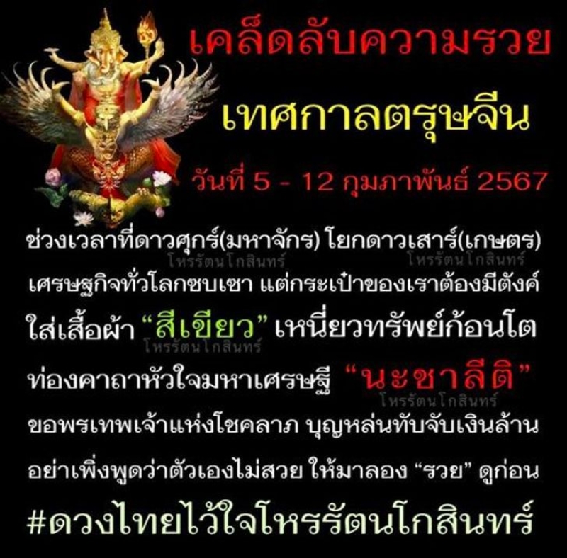 วันที่ 5 - 12 กุมภาพันธ์ 2567 ช่วงเวลาที่ดาวศุกร์มหาจักร) โยกดาวเสาร์(เกษตร) เศรษฐกิจทั่วโลกซบเซา แต่กระเป๋าของเราต้องมีตังค์ ใส่เสื้อผ้า "สีเขียว" เหนี่ยวทรัพย์ก้อนโต ท่องคาถาหัวใจมหาเศรษฐี "นะชาลีติ" ขอพรเทพเจ้าแห่งโชคลาภ บุญหล่นทับจับเงินล้าน อย่าเพิ่งพูดว่าตัวเองไม่สวย ให้มาลอง "รวย" ดูก่อน