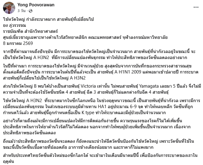 การระบาดของไข้หวัดใหญ่ ในประเทศไทยมีผู้ป่วยเป็นจำนวนมากและเพิ่มขึ้นทุกปี โดย ยง ภู่วรวรรณ ยง ภู่วรวรรณ ราชบัณฑิต สำนักวิทยาศาสตร์ ศูนย์เชี่ยวชาญเฉพาะทางด้านไวรัสวิทยาคลินิก คณะแพทยศาสตร์ จุฬาลงกรณ์มหาวิทยาลัย