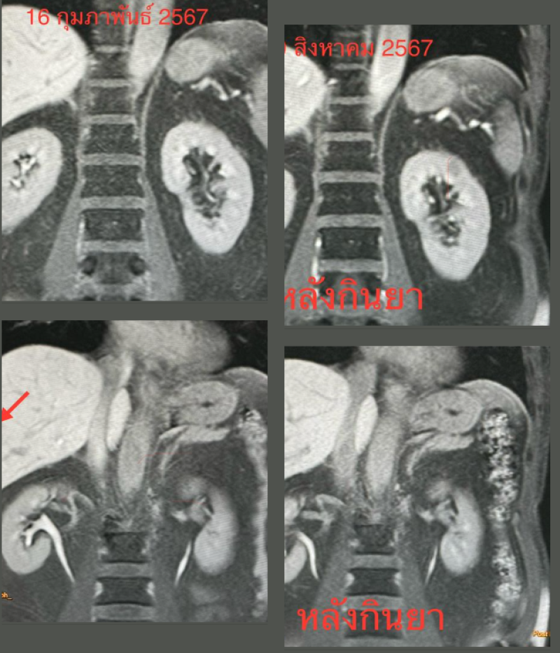 ติดตามคนไข้ 6 เดือนหลังกินยาฆ่าพยาธิ วันที่ 19 สิงหาคม 2567 ไม่ปวดท้อง ไม่มีไข้ กินอาหารได้ เจาะเลือดพบจำนวนเม็ดเลือดขาว 5,620 เซลล์ เป็นเซลล์ชนิด eosinophil 8% (ลดลงเดิม 37%) ติดตามคลื่นแม่เหล็กไฟฟ้า MRI ของตับพบก้อนทั้ง 2 ก้อนในตับข้างขวาขนาดเล็กลงมาก