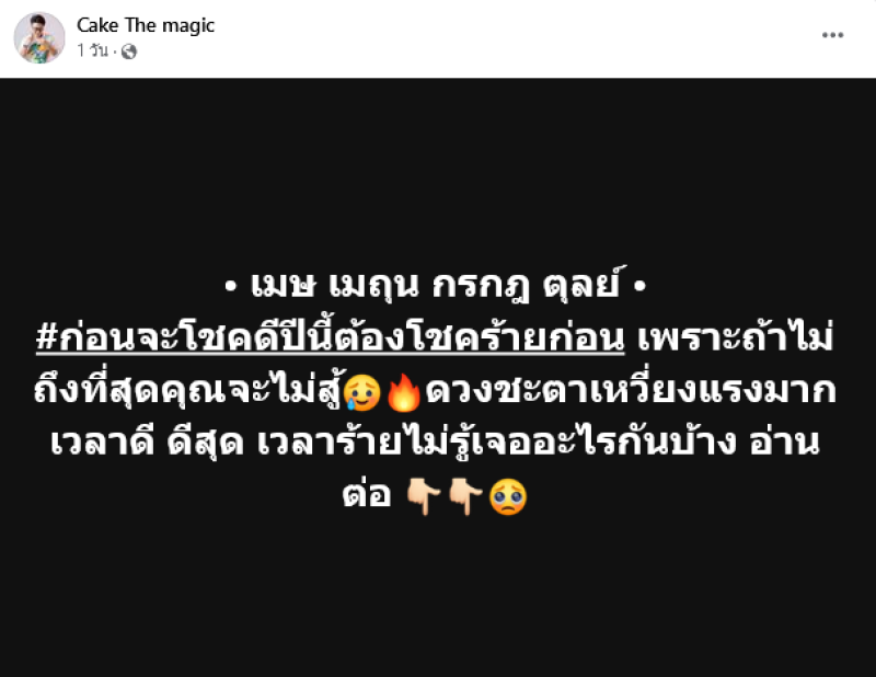 วันที่ 23 ก.พ.67 เพจ Cake The magic ของ หมอเค้ก เผยแพร่คำทำนายระบุ 4 ราศี ก่อนจะโชคดีปีนี้ต้องโชคร้ายก่อน เพราะถ้าไม่ถึงที่สุดคุณจะไม่สู้ ดวงชะตาเหวี่ยงแรงมาก เวลาดี ดีสุด เวลาร้ายไม่รู้เจออะไรกันบ้าง ดวงชะตาของคุณถูกถาโถมด้วยความเจ็บปวด ปัญหาจะรุมร้อมมาพร้อมกัน เพราะดวงชะตาจะกลับจากร้ายกลายเป็นดี