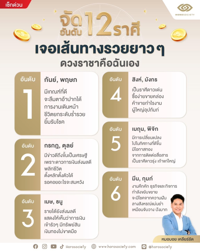 เมื่อวันที่ 25 ก.พ 67 ที่ผ่านมา ทางเพจ Horosociety หมอบอย เคลียร์ชัด นักดูดวงและราศี โดยได้จัดอันดับคนดวงดี 12 ราศี เจอเส้นทางรวยยาวๆ ดวงราชา ถึงเวลาลืมตาอ้าปาก บอกลาความจน เตรียมรับทรัพย์ใหญ่