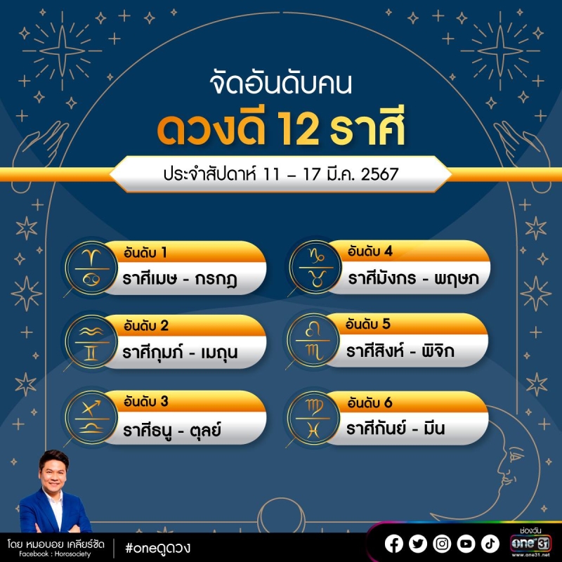 เมื่อวันที่ 12 มี.ค. 67 ที่ผ่านมา ทางเพจ Horosociety หมอบอย เคลียร์ชัด นักดูดวงและราศี โดยได้จัดอันดับคนดวงดี 12 ราศี ประจำสัปดาห์ที่ 11 - 17 มีนาคม 2567