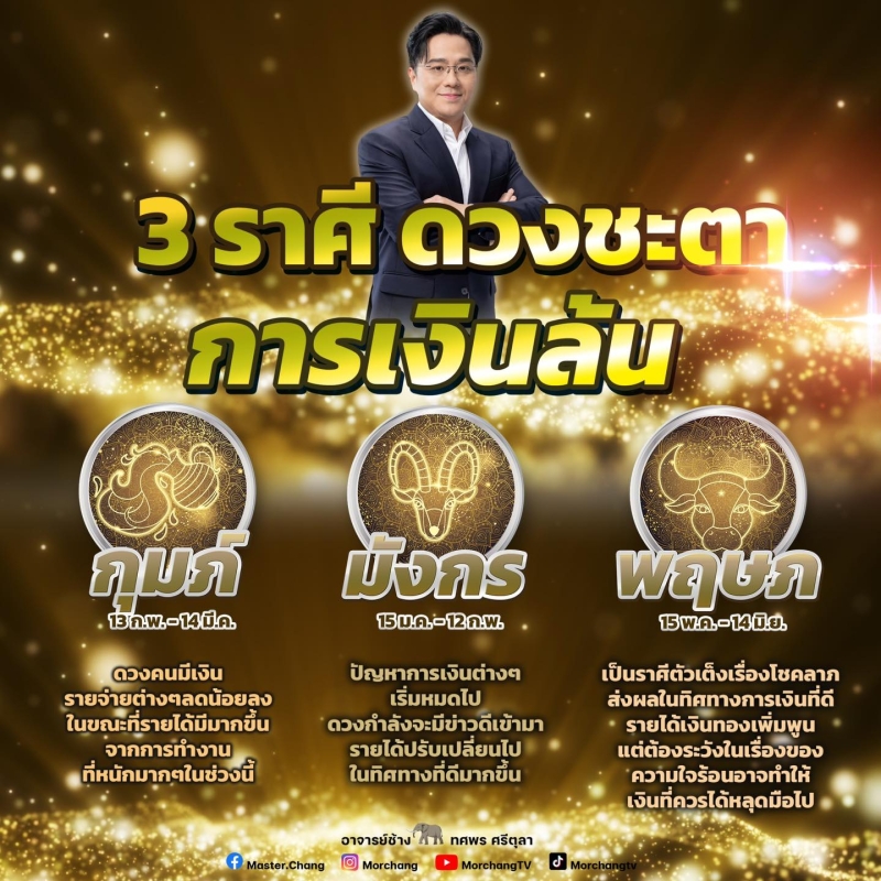 หมอช้าง ทศพร ศรีตุลา เผยถึงดวงชะตาราศีการเงินล้น ดวงคนมีเงิน รายจ่ายต่างๆ ลดน้อยลง ในขณะที่รายได้มีมากขึ้นจากการทำงานที่หนักมากๆ ในช่วงนี้ ปัญหาการเงินต่างเริ่มหมดไป ดวงกำลังจะมีข่าวดีเข้ามา รายได้ปรับเปลี่ยนไปในทิศทางที่ดีมากขึ้น