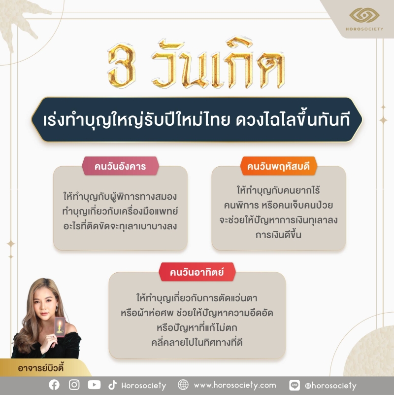 วันที่ 22 มีนาคม 2567 จากเพจ Horosociety อาจารย์บิวตี้ ได้ออกมาทำนายดวงชะตา 3 วันเกิด ใกล้ปีใหม่ไทยแล้วเค้าว่าดวงจะเปลี่ยน มาเร่งทำบุญรับสิ่งดีๆกัน